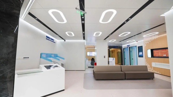 建设银行从化江埔支行营业大厅装修现代简洁,天花板沿用椭圆形造型灯具,融入蓝色品牌元素,整体布局通透有序。