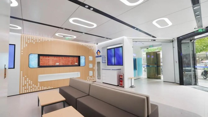此外,营业大厅采用模块化装修,增设惠普金融服务区、线上服务区等特色功能区,并配备嵌入式防爆柜,防弹、防尾随联动互锁安全门。