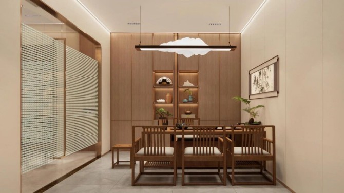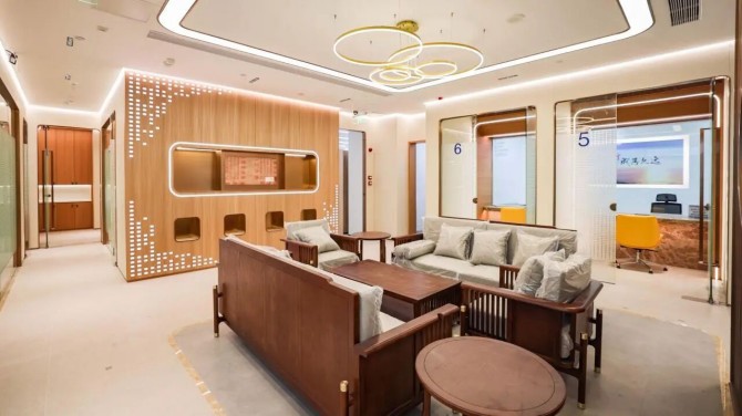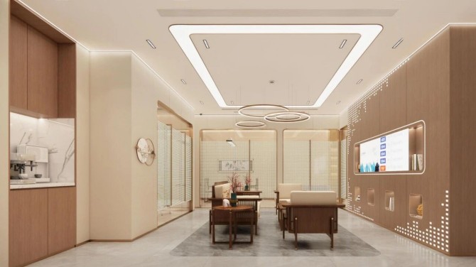 接待、洽谈功能区装修风格融合现代简约与中式雅致,色调以暖木色、米白及浅灰为主。贵宾理财中心为开放式空间,设置接待吧台、沙发等候区。茶艺(洽谈)室更显私密,以大圆桌、圈椅营造交流氛围。