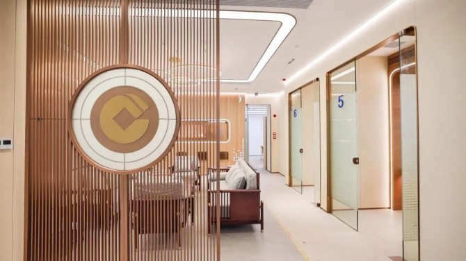 理财中心整体装修风格庄重雅致,入口处品牌标识竖条格栅装饰屏风彰显特色,天花、吊灯及家具装饰巧妙融入了“方”与“圆”的视觉元素,呼应建设银行企业文化中的“规矩严谨”与“融通和谐”,营造出包容、祥和的空间氛围。