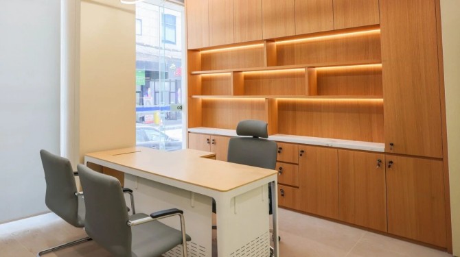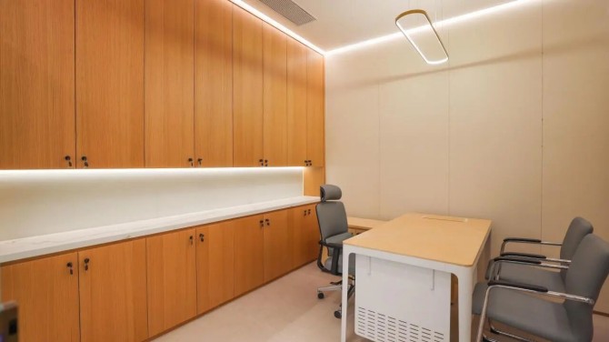 接待、洽谈等功能区域,以温暖的木质元素为主色调,搭配简洁利落的桌椅与大容量收纳柜体,柔和的灯光从柜体层架间透出,空间整洁通透,尽显对客户体验的细致考量。