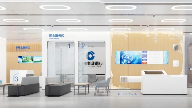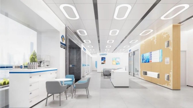 项目装修严格遵循建设银行视觉形象标准,打造"蓝白"主色调统一空间,融合“建行蓝”品牌元素装饰细节,体现国有商业银行大家风范。