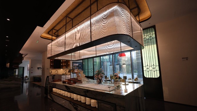酒店自助餐厅环形吧台如星轨流转,流畅无断点的环形弧线为核心造型,采用整幅大花绿石材做弧形通铺。奢石底座与灯带交织,顶部磨砂玻璃柔化光线,与大堂遥相呼应,将邂逅的惬意敛入微光。