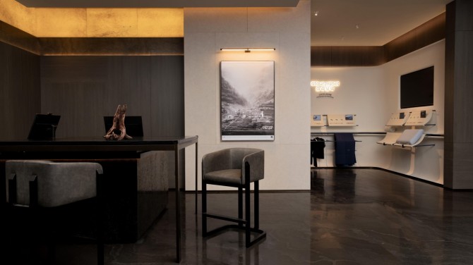 大堂接待台突破传统前台模式,以高岛台与吧台椅结合的设计,兼顾快速办理与休憩停留需求。