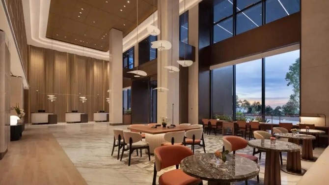 酒店大堂接待区纵向延伸的木质格栅墙面及大理石地面以自然纹理铺陈出优雅底色,落地玻璃幕墙透光透景,营造出大气与温馨兼具的迎宾氛围。