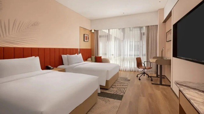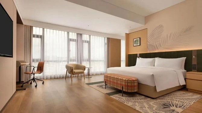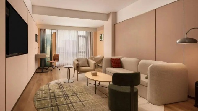 酒店客房以米白、浅色木纹、暖棕等色调为主,大量运用木饰面,打造出“自然亲和 松弛治愈”的旅居格调。