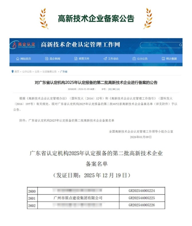 2025年,原点建设集团不断夯实基础,在业务资质、行业地位、技术研发等方面持续精进,提升综合竞争力,凭借深厚的行业积淀与技术实力,跻身全国装饰百强企业、国家高新技术企业等行列。