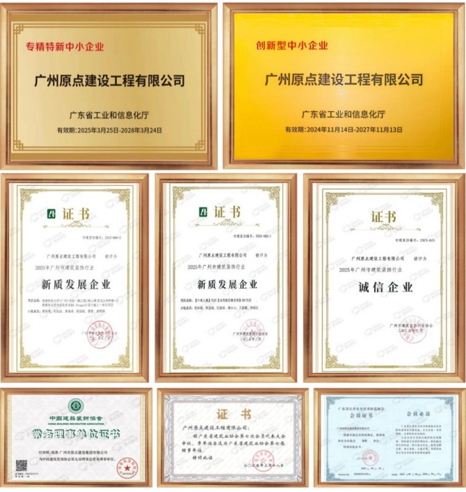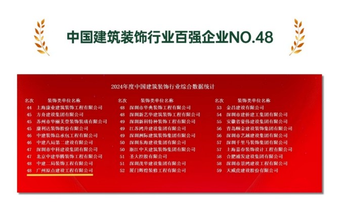 原点建设连续九年荣登“中国建筑装饰百强企业”榜单(第48位),并相继获评国家高新技术企业,广东省专精特新企业、创新型中小企业,广州市建筑装饰行业新质发展企业及诚信企业。