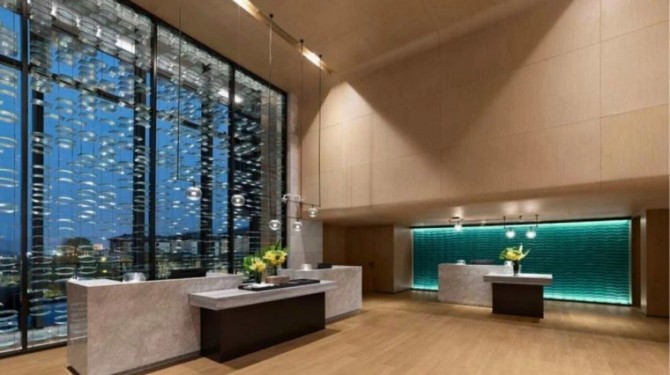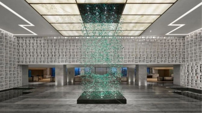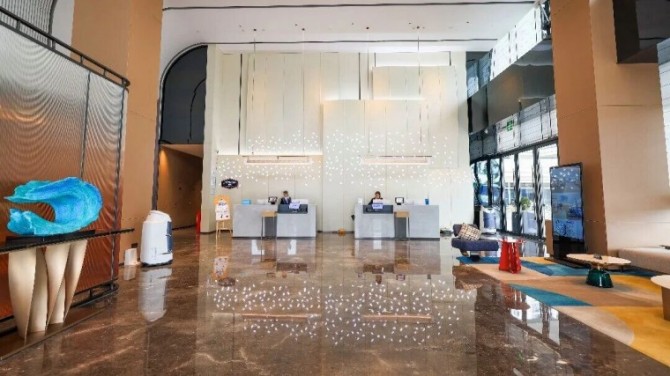 项目以“水的多元形态”为设计主题,大堂整体空间简洁有序,打造了舒朗自在的仪式感和宏大气场。