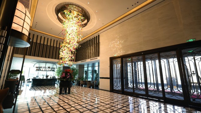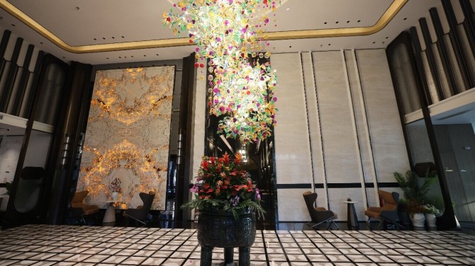 酒店大堂中央,艺术吊灯以彩色构件复刻繁花盛放之姿,流光溢彩,下方铜鼎则庄重而立,动静相生,成为整个空间点睛之笔。