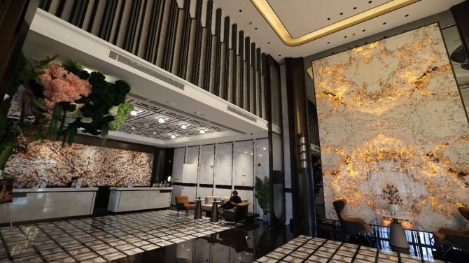 酒店大堂空间,奢石为骨,繁花为韵,灯树为幔,围合之美。入此境,享安然。