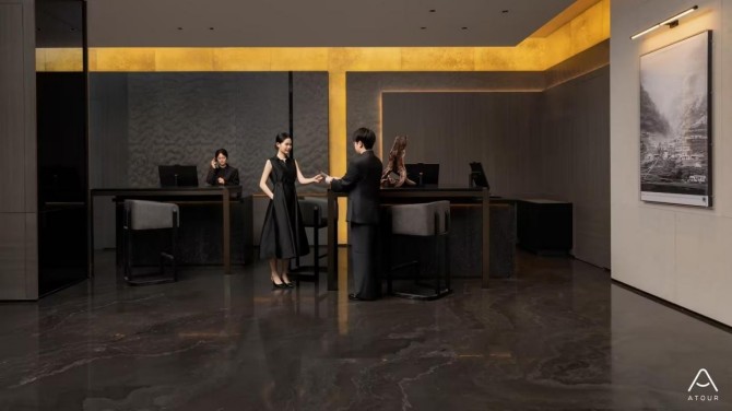 大堂接待台突破传统前台模式,以高岛台与吧台椅结合的设计,兼顾快速办理与休憩停留需求。