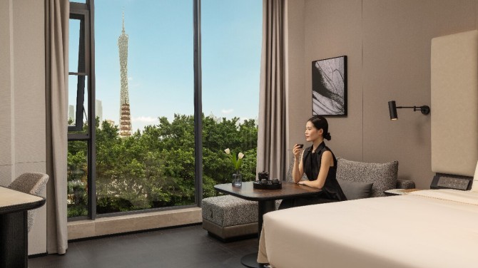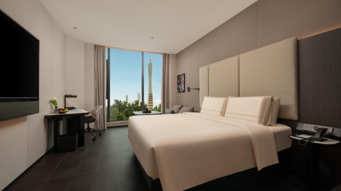 广州塔景观房客房采用落地窗最大化引入室外视野,宾客倚窗而坐,即可无遮挡饱览广州塔、赤岗塔等城市地标风景。