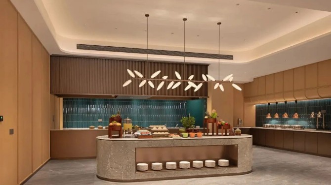 酒店全日餐厅延续开阔布局,搭配自然木质与暖色灯光,营造轻松温馨的用餐氛围,构建“家的温度”。