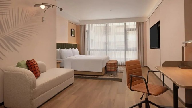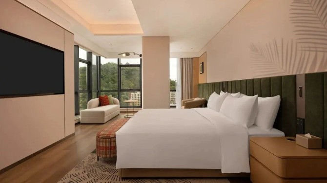 酒店客房以米白、浅色木纹、暖棕等色调为主,大量运用木饰面,打造出“自然亲和 松弛治愈”的旅居格调。